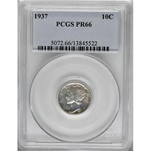 <B>1937 10C PR66 PCGS.</B></I> PCGS Population (472/205). NGC Census: (365/188). Mintage: 5,756. Numismedia Wsl. Price for NGC/PCGS coin in PR66: $710. (#5072)<BR><BR><B>Coin Engraver:</B> Adolph A. Weinman<BR><BR><b>Shipping:</b> Coins & Currency (<a target="_blank" href="http://www.heritageauctions.com/common/shipping.php">view shipping information</a>)
