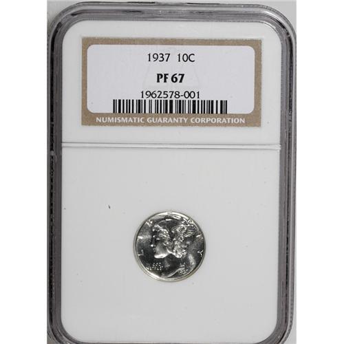 <B>1937<10C> PR67 NGC.</B></I> A deeply mirrored Superb Gem Proof with essentially untoned and trouble-free surfaces. A tiny spot of cherry-red rim toning appears on the reverse rim at 7 o'clock.