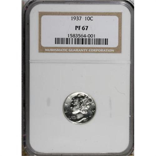 <B>1937 10C PR67 NGC.</B></I> A boldly impressed blast-white representative of this popular early proof Mercury dime. Beautifully preserved with gleaming fields and incredible visual appeal.<BR><BR><B>Coin Engraver:</B> Adolph A. Weinman<BR><BR><b>Shipping:</b> Coins & Currency (<a target="_blank" href="http://www.heritageauctions.com/common/shipping.php">view shipping information</a>)