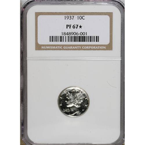 <B>1937 10C PR67 <img border='0' src='http://www.heritagecoins.com/images/star.gif' width=10 height=10> NGC.</B></I> This flawless and fully brilliant Superb Gem has a needle-sharp strike, but the Star designation was presumably awarded because the reverse has cameo contrast, as does Liberty's winged cap. Liberty's cheek and neck lack contrast, as always for this proof date, although PCGS has certified a solitary PR66 piece as Cameo. Census: 2 in 67 S, none finer with a <img border='0' src='http://www.heritagecoins.com/images/star.gif' width=10 height=10> designation (2/07).<BR><BR><b>Shipping:</b> Coins & Currency (<a target="_blank" href="http://www.heritageauctions.com/common/shipping.php">view shipping information</a>)