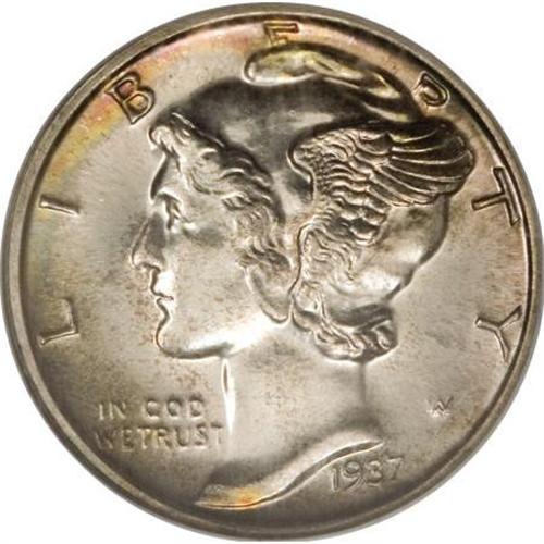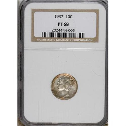 <B>1937 10C PR68 NGC.</B></I> David Lange (2005) writes of 1937 proof dimes that "Their survival rate in gem condition seems to be higher as a percentage of total mintage." NGC/PCGS census/population data do indeed indicate a plentiful supply of this issue through the Premium Gem level. The numbers drop off in PR67, and the lofty grade of PR68 is rare. Wisps of iridescent cobalt-blue, lavender, and olive-tan visit both sides of this exquisitely struck specimen. Impeccably preserved surfaces do not deny the grade designation. Census: 24 in 68, 0 finer (5/07).<BR><BR><b>Shipping:</b> Coins & Currency (<a target="_blank" href="http://www.heritageauctions.com/common/shipping.php">view shipping information</a>)