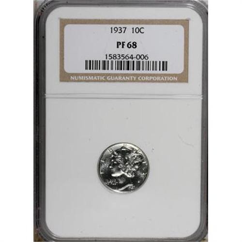 <B>1937 10C PR68 NGC.</B></I> A pristine and fully struck stone-white representative of this low mintage proof issue. Time has been kind to this flashy specimen, which looks the same today as when it was struck seven decades ago. None have been certified finer by either major service (7/07).<BR><BR><B>Coin Engraver:</B> Adolph A. Weinman<BR><BR><b>Shipping:</b> Coins & Currency (<a target="_blank" href="http://www.heritageauctions.com/common/shipping.php">view shipping information</a>)