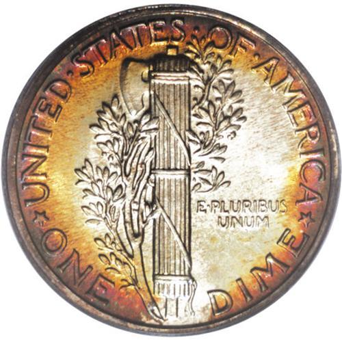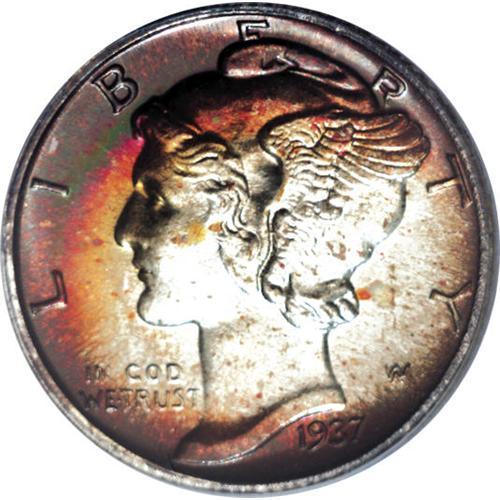 <B>1937 10C PR68 PCGS.</B></I> An exquisitely preserved and captivatingly toned representative of the second of seven proof Mercury dime issues. The obverse has outer bands of amethyst and citrine, while watermelon and yellow-green colors grace the reverse periphery. The silver-gray centers display immense reflectivity, and the strike is decisive. Population: 20 in 68, 0 finer (4/07).<BR><BR><b>Shipping:</b> Coins & Currency (<a target="_blank" href="http://www.heritageauctions.com/common/shipping.php">view shipping information</a>)