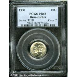 <B>1937 10C PR68 PCGS.</B></I> Extraordinary surface preservation for this second-year proof. There is not even a hint of toning on either side, and the glassy surfaces are equally free of even the slightest disturbance. Population: 19 in 68, 0 finer (1/05).<BR><I>From the Bruce Scher #1 All-Time PCGS Registry Set.</B></I> Lot:4077