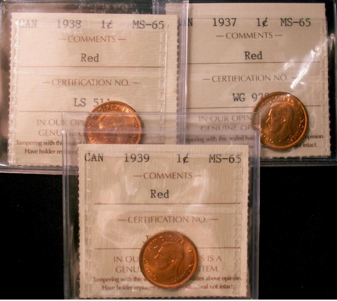 1937, 1938 & 1939 1¢ ICCS MS65RD. Lot of 3 coins all full red.