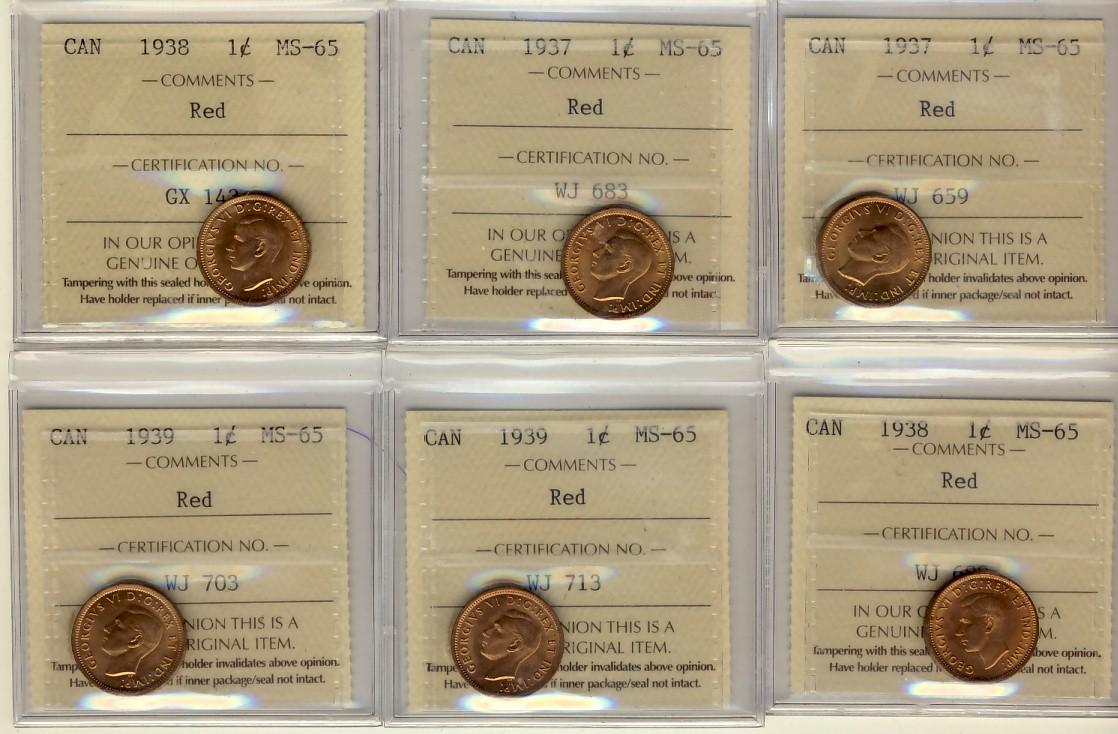 1937, 1938 & 1939 1¢ ICCS MS65RD. Lot of 6 coins, two of each date.