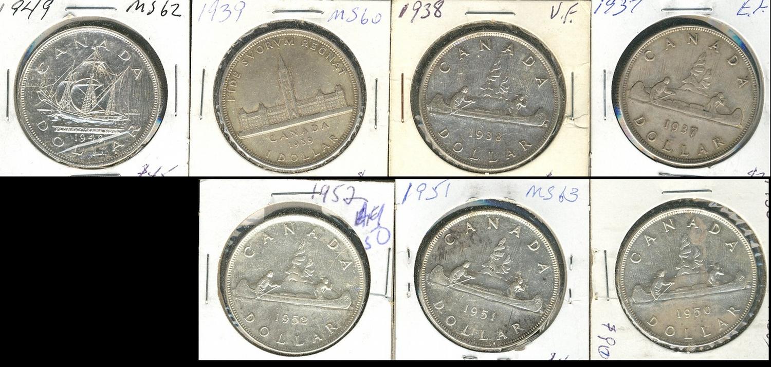 1937, 1938, 1939, 1946, 1949, 1950, 1951 & 1952 $1. Lot of 7 coins all VF to AU.