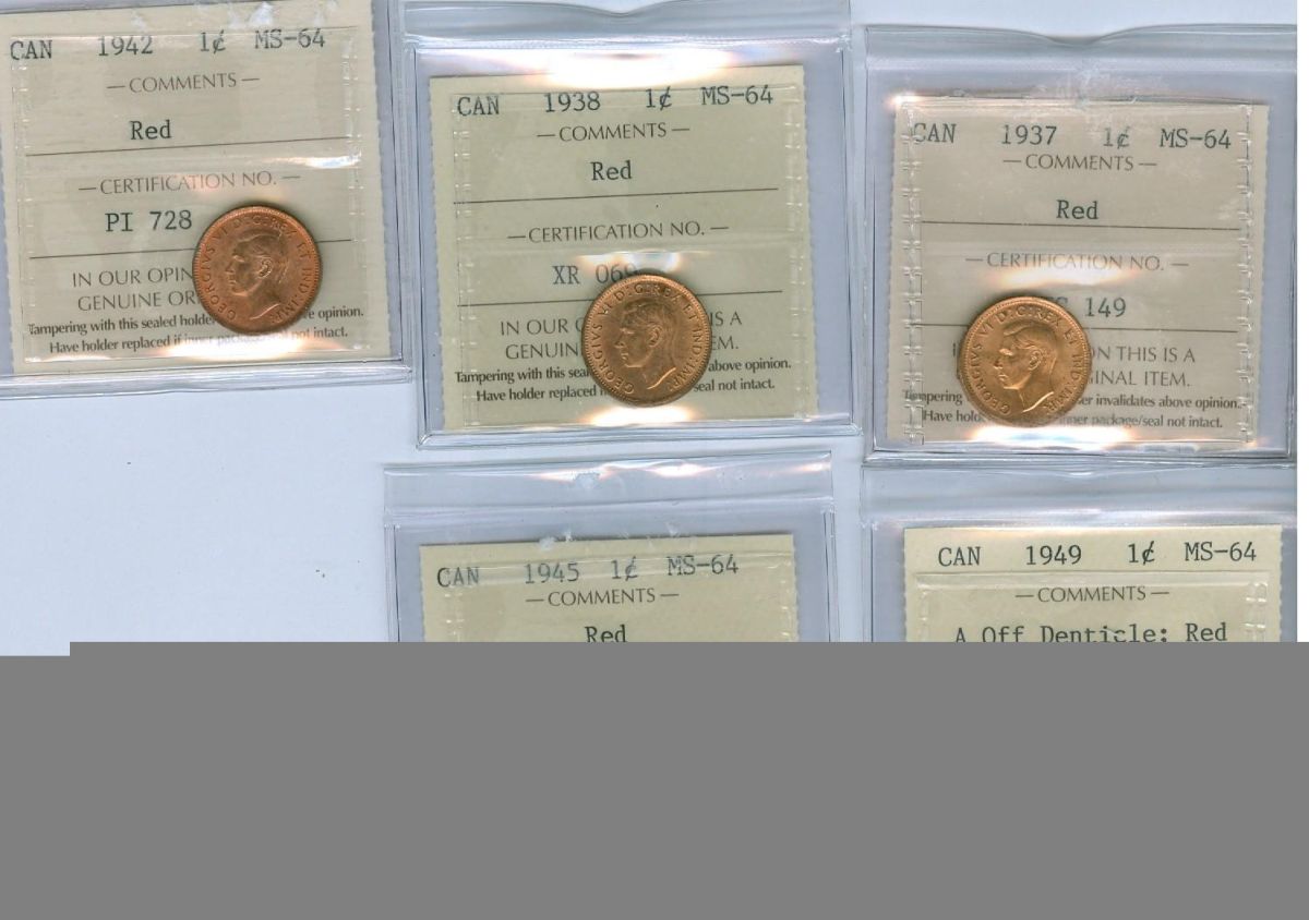 1937, 1938, 1942, 1945 & 1949 A Off 1¢ ICCS MS64RD. Lot of 5 coins all red.
