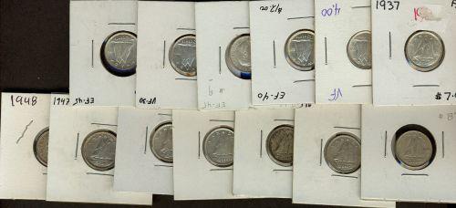 1937, 1938 (2), 1946 (5), 1947 (4), 1948. Lot of 13 pieces, grades vary from EF-40 to MS-60.
