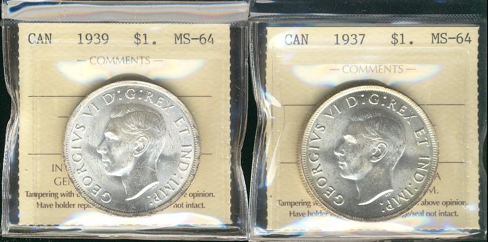 1937 & 1939 $1 ICCS MS64. Lot of 2 coins both white and lustrous.