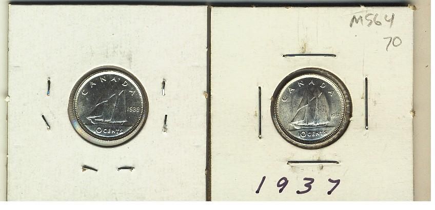 1937, 1939 10¢, MS64. Both coins are brilliant and lustrous.