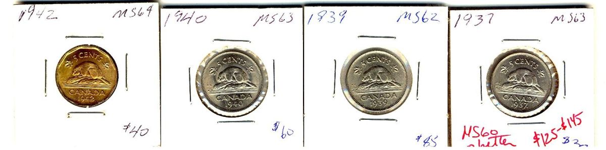 1937, 1939, 1940 & 1942 Tombac 5¢. Lot of 4 coins all MS60 or better.