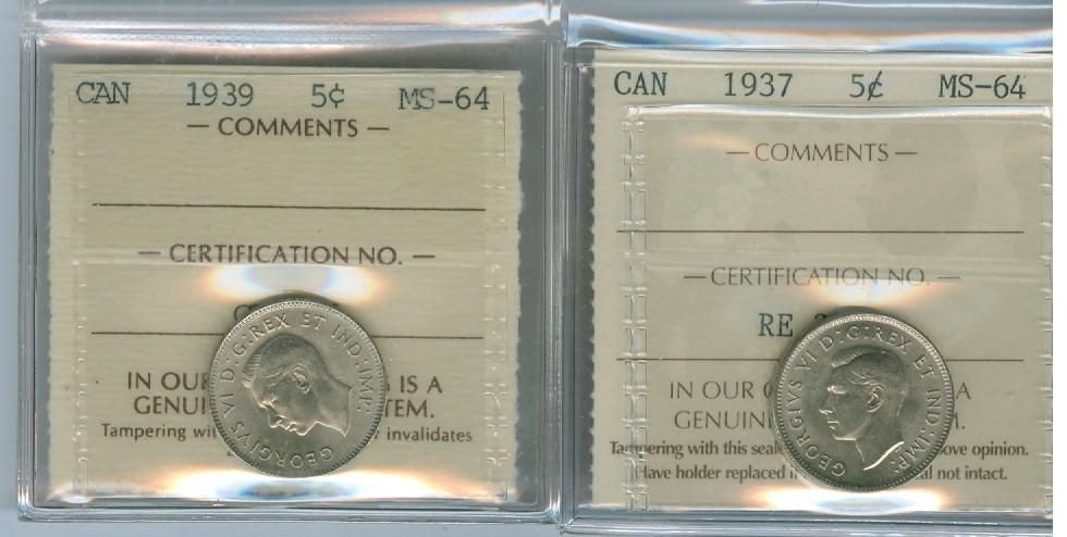 1937 & 1939 5¢ ICCS MS64. Lot of 2 coins.