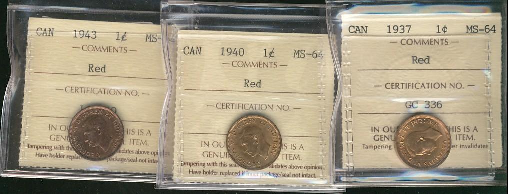 1937, 1940 & 1943 1¢ ICCS MS64RD. Lot of 3 coins.