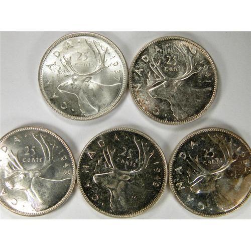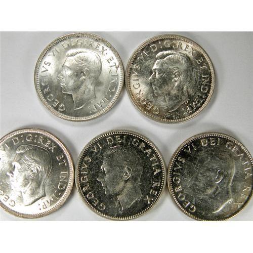 Canada Twenty-Five Cents 1937, 1941, 1943, 1949 and 1952 Low Relief. Five pale toned pieces, all Choice Uncirculated