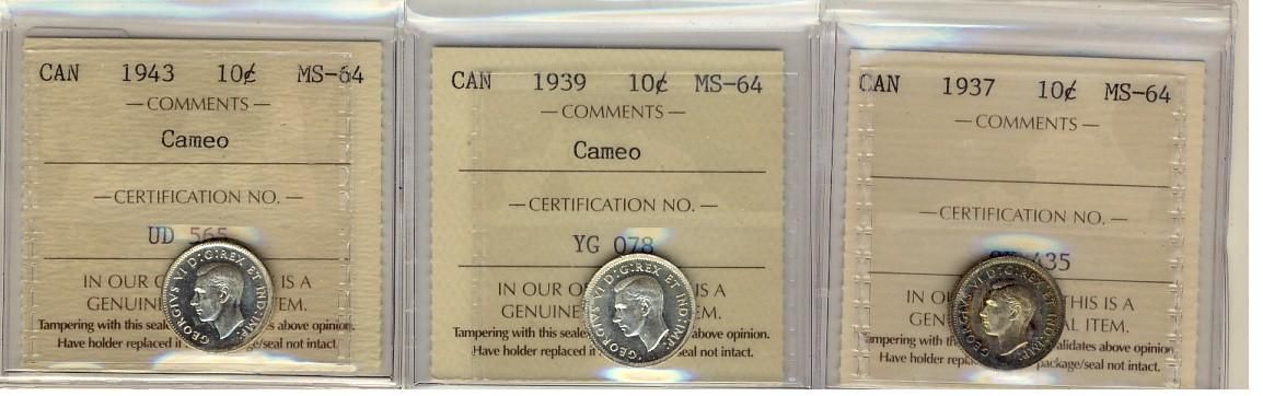 1937, 1942 & 1943 10¢ ICCS MS64. Lot of 3 coins all with different shades of toning.