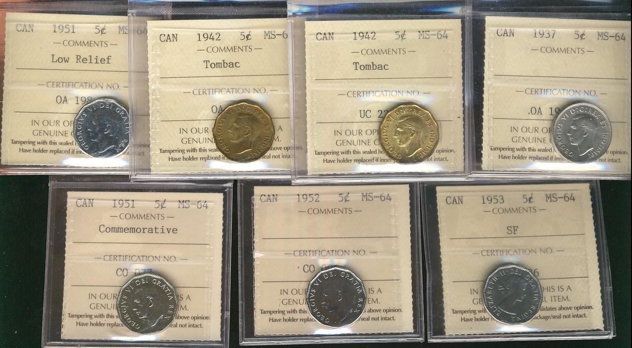 1937, 1942 T(2), 1951 LR, 1951 Commem, 1952 & 1953 SF 5¢. Lot of 7 coins all ICCS MS64 Graded.