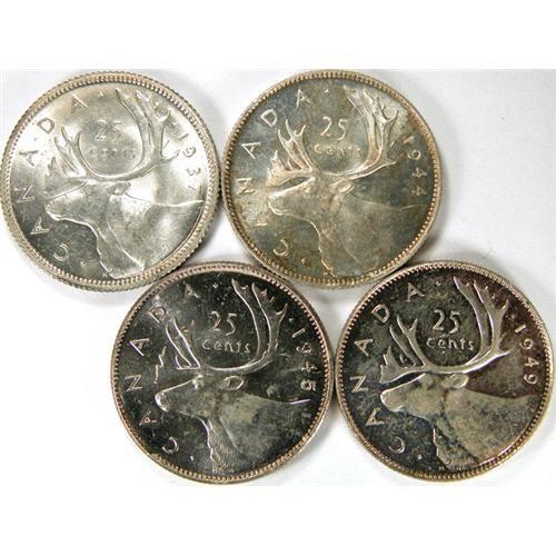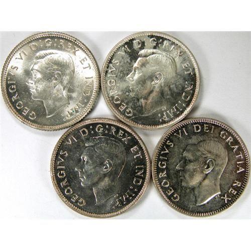 Canada Twenty-Five Cents 1937, 1944, 1945 and 1949. Four pale toned pieces, all Choice Uncirculated