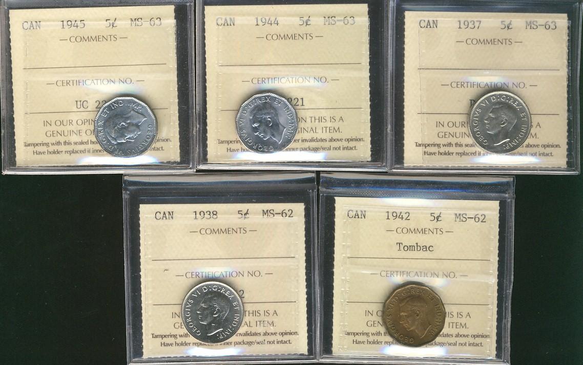 1937, 1944, 1945 5¢ MS63 & 1938, 1942 Tombac MS62. Lot of 5 coins all ICCS graded.
