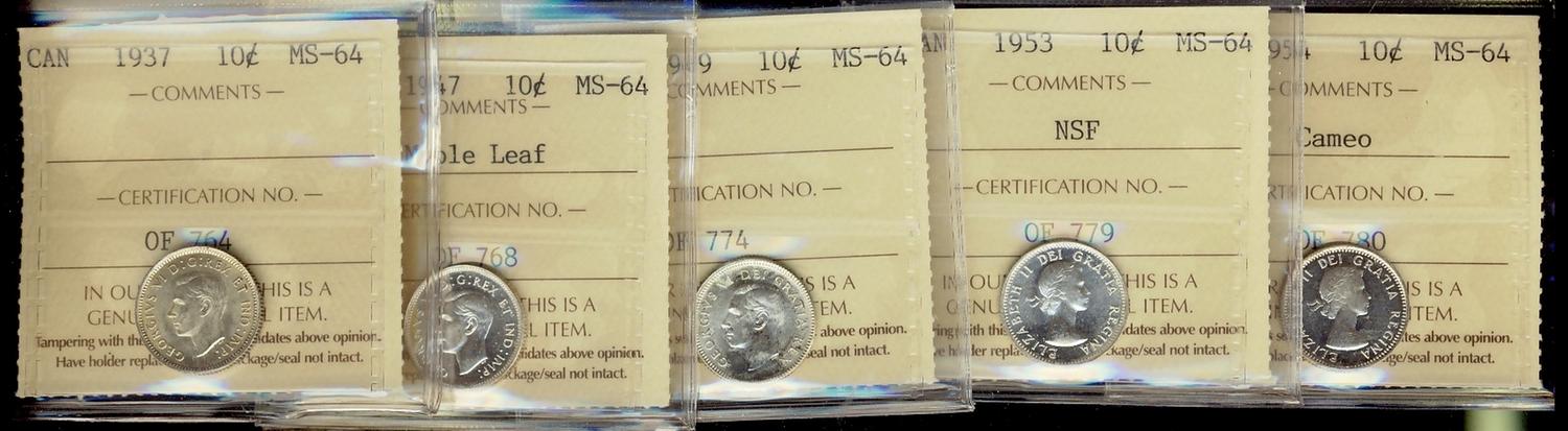 1937, 1947 ML, 1949, 1953NSF, 1954 Cameo, 10¢ all ICCS MS64, Lot of 5 coins,