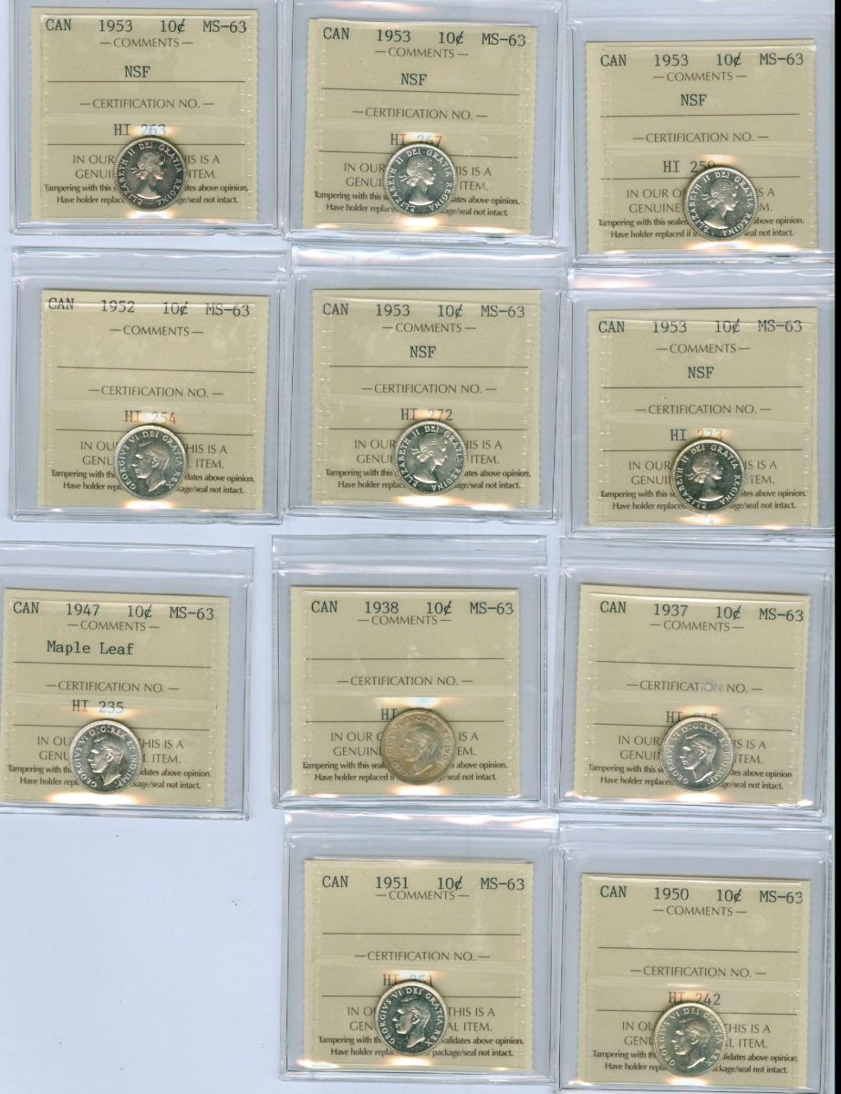 1937-1953 NSF 10¢ ICCS MS63. Lot of 11 coins including 1937, 1938, 1947 ML, 1950, 1951, 1952, 1953 NSF (5).