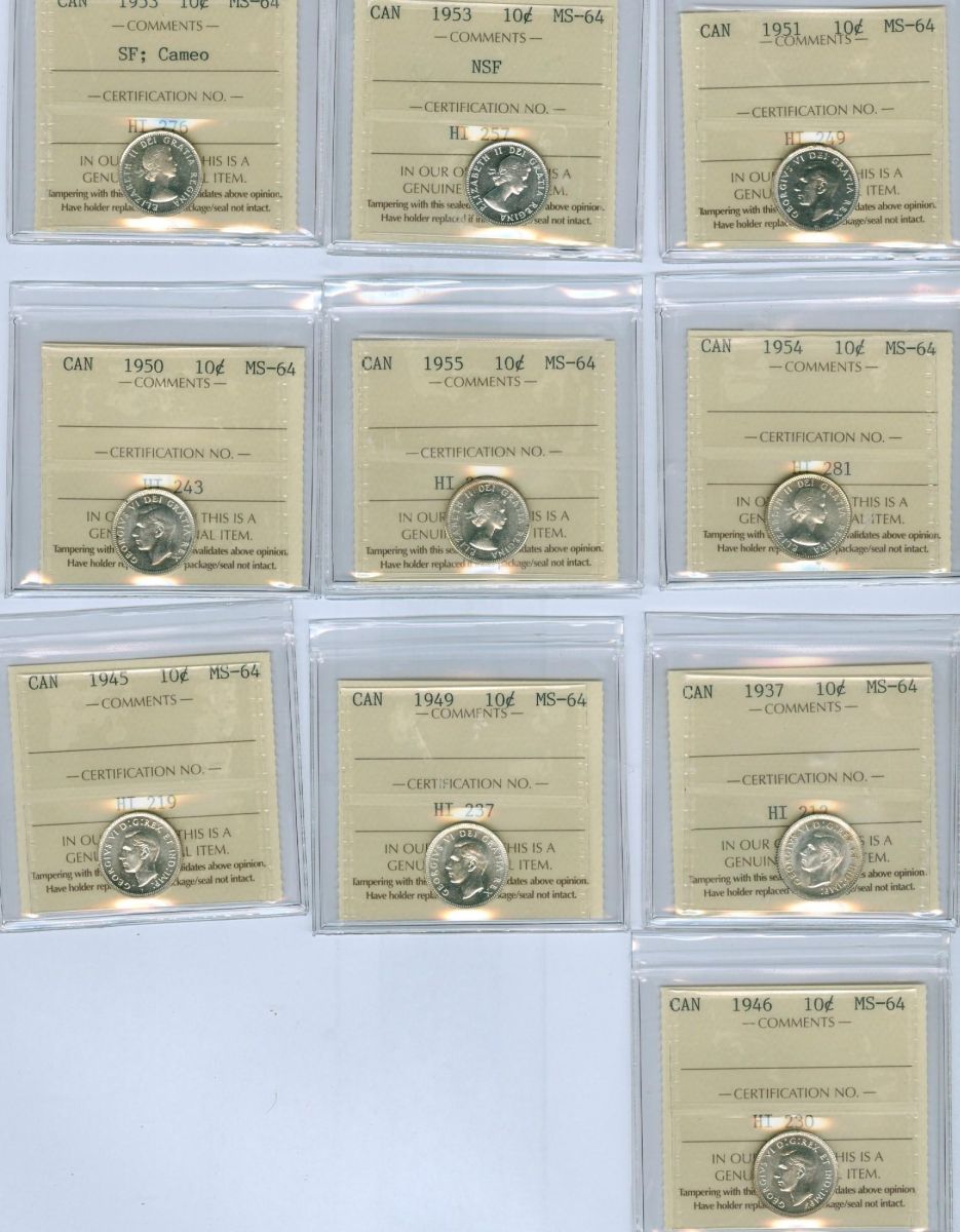 1937-1955 10¢ ICCS MS64. Lot of 10 coins including 1937, 1945, 1946, 1949, 1950, 1951, 1952, 1953 NSF, 1953 SF Cameo, 1954 and 1955,