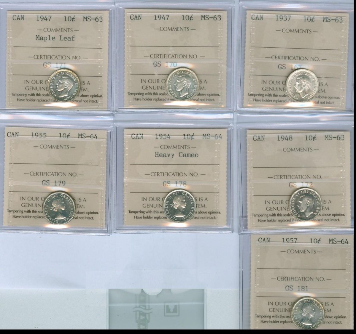 1937 - 1957 10¢. Lot of seven ICCS grade coins including, 1937 MS63, 1947 MS63, 1947 ML MS63, 1948 MS63, 1954 Hvy Cam MS64, 1955 MS64 and 1957 MS64.
