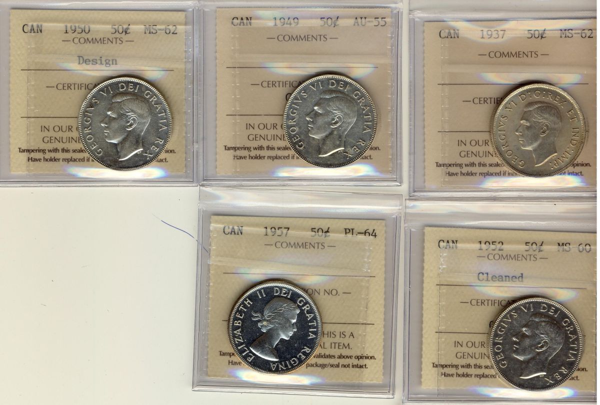 1937-1957 50¢. Lot of five ICCS certified coins. Includes 1937 MS62, 1949 AU55, 1950 Des MS62, 1952 Cleaned MS60 and 1957 PL64.