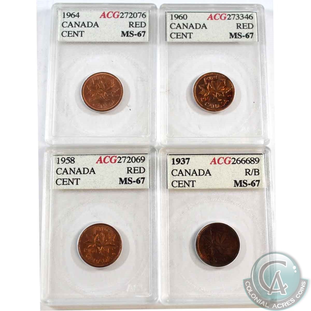 1937, 1958, 1960 & 1964 Canada 1-cent AGC Certified MS-67. 4pcs