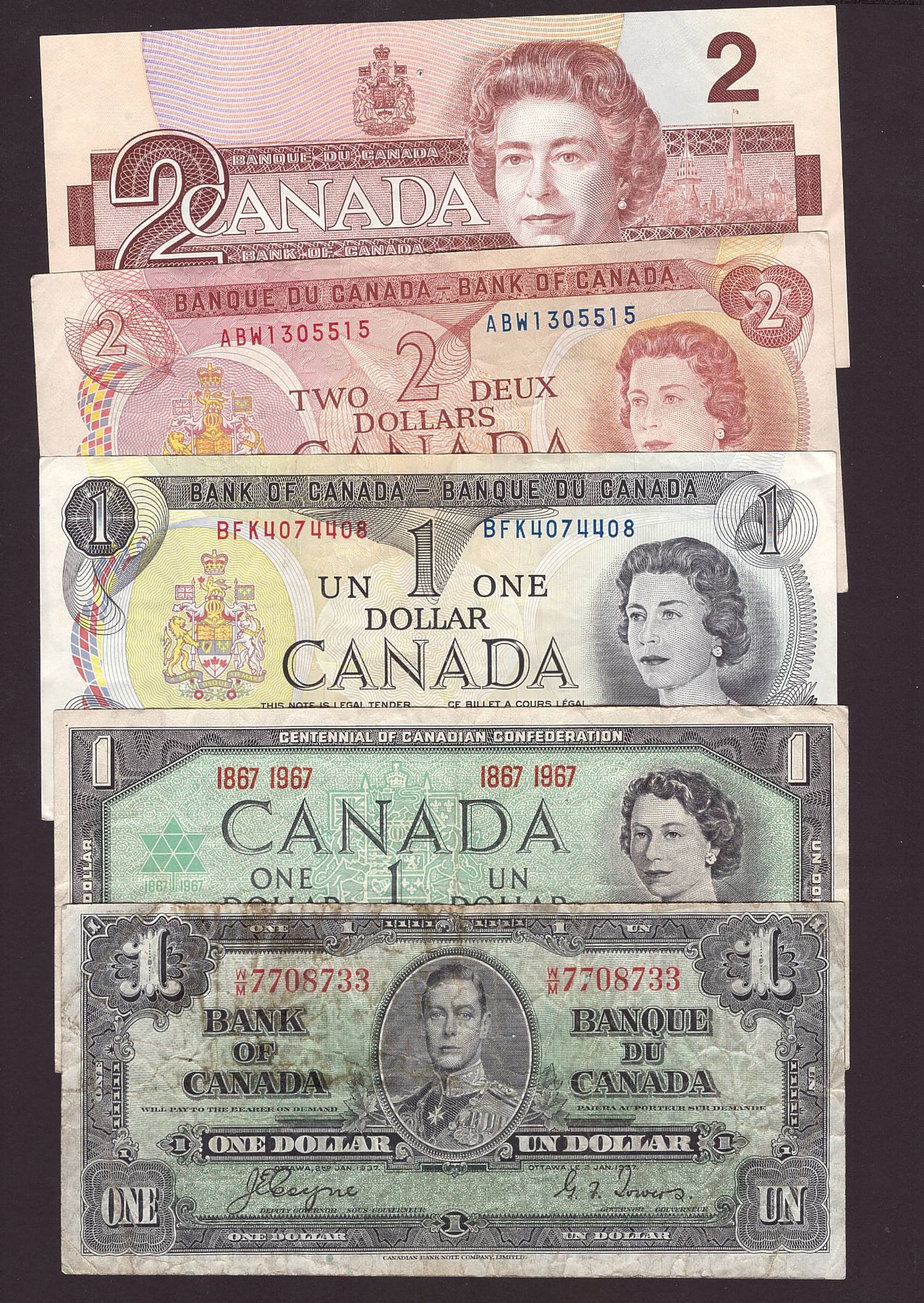 includes 5x Bank of Canada Bannotes 1x1937 $1 Banknote 1x 1967 $1 Banknote 1x1973 $1 Banknote 1x1974 $2 Banknote 1x1986 $2 Banknote