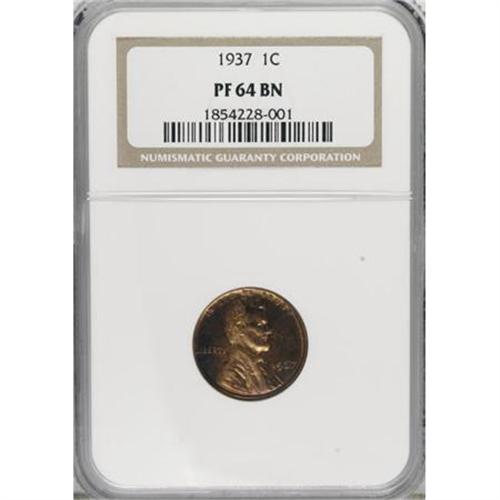 <B>1937 1C PR64 Brown NGC.</B></I> NGC Census: (3/1). PCGS Population (2/0). Mintage: 9,320. Numismedia Wsl. Price for NGC/PCGS coin in PR64: $65. (#3336)<BR><BR><b>Shipping:</b> Coins & Currency (<a target="_blank" href="http://www.heritageauctions.com/common/shipping.php">view shipping information</a>)