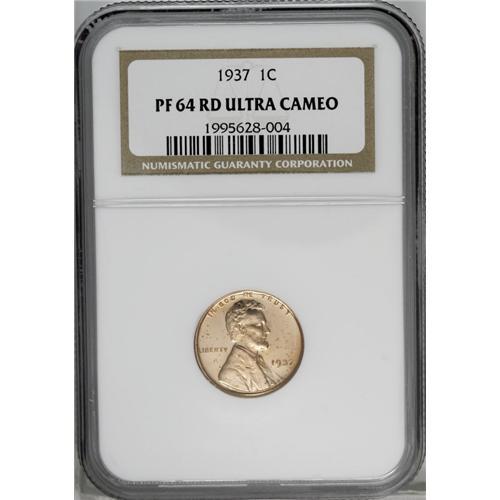 <B>1937<1C> PR64 Red Deep Cameo NGC.</B></I> While a few tiny pinpricks to the left of the portrait keep this dazzling golden-orange specimen from the Gem level, the degree of contrast between fields and devices is nothing short of phenomenal for this second-year (of the modern era) proof issue. Census: 1 in 64 Deep Cameo, 0 finer (3/06). <BR><BR><B>Important notice:</B> Heritage usually auctions material at the rate of 200-250 lots per hour. On some occasions eBay Live bid software or the Internet may not be able to keep up with the pace of the auction. We recommend placing a realistic absentee bid now as insurance to avoid disappointment. Occasionally the auctioneer may eliminate or reject an eBay Live bid, and the auctioneer may also reopen a lot after the close of the eBay live bidding (usually because we missed an audience bid), and may reject your bid even if it shows you as the winning bidder. By bidding via eBay Live, you agree that Heritage may award the lot to another bidder at its sole discretion under the circumstances described above or any other reasonable circumstances. Since eBay bids are not shown to us until we open the lot on the floor, we treat those bids just like floor bids. In most cases the floor responds before the eBay bid is presented to us, due to Internet lag time, so for consistency we have made it a policy that floor bids are always considered first over tie eBay live bids. Also please note that all Heritage lots purchased through eBay Live carry a 20% Buyer's Premium. Please make sure you read the Terms and Conditions before you bid. This lot is being auctioned in conjunction with a live floor auction by Heritage Galleries & Auctioneers. All final auction and invoice information will be supplied by Heritage Galleries & Auctioneers, and all other information should be considered preliminary. Lot:705 <BR><BR><B>Winning Notification and Billing:</B> After the FINAL session in this auction is complete, Heritage will send e-mail and snail mail invoices. This process normally takes several days. All final auction and invoice information will be supplied by Heritage Galleries & Auctioneers, and all other information should be considered preliminary. <BR><BR>This auction will be conducted on a live auction floor and over the Internet through eBay Live. If you choose to place an absentee bid, please take a moment to <font color='#0000ff'><u><a href='http://pages.ebay.com/liveauctions/help/before/laabsentee.html'>learn how eBay Live absentee bidding works</a></u></font><font color='#000000'>