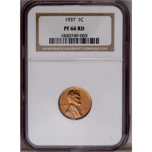 <B>1937<1C> PR66 Red NGC.</B></I> Brilliant orange surfaces display exquisitely struck design elements, and are devoid of significant contact marks. A couple of minute flecks are noted on each side. A squiggly lint mark is visible in the field above the Y in LIBERTY. Census: 70 in 66, 10 finer (1/06).