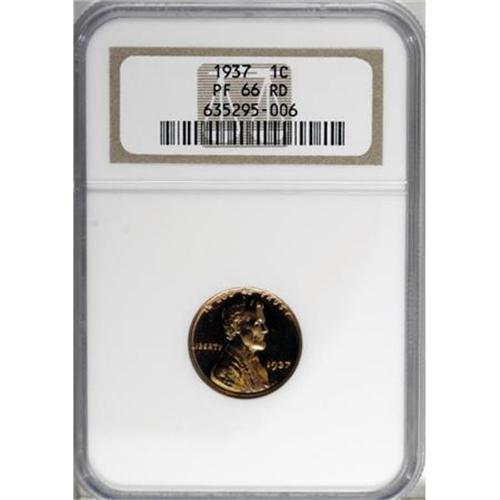 <B>1937 1C PR66 Red NGC.</B></I> The gleaming copper-orange exemplar offered here offers practically chromelike brilliance on the obverse. A decisively struck and delightful exemplar, one of just 9,320 specimens coined. NGC has graded 13 finer Red representatives (12/07).<BR><BR><B>Coin Engraver:</B> Victor D. Brenner<BR><BR><b>Shipping:</b> Coins & Currency (<a target="_blank" href="http://www.heritageauctions.com/common/shipping.php">view shipping information</a>)