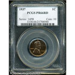 1937 1C PR66 Red PCGS. Cherry-red patina with pinp <B>1937 1C PR66 Red PCGS.</B></I> Cherry-red patina with pinpoint striking details and deeply mirrored surfaces. Both sides of the coin seem pristine, on this no-questions premium Gem. Population: 142 in 66, 9 finer (10/04). <BR><BR><B>Important notice:</B> Heritage usually auctions material at the rate of 200-250 lots per hour. On some occasions eBay Live bid software or the Internet may not be able to keep up with the pace of the auction. We recommend placing a realistic absentee bid now as insurance to avoid disappointment. Occasionally the auctioneer may eliminate or reject an eBay Live bid, and the auctioneer may also reopen a lot after the close of the eBay live bidding (usually because we missed an audience bid), and may reject your bid even if it shows you as the winning bidder. By bidding via eBay Live, you agree that Heritage may award the lot to another bidder at its sole discretion under the circumstances described above or any other reasonable circumstances. Since eBay bids are not shown to us until we open the lot on the floor, we treat those bids just like floor bids. In most cases the floor responds before the eBay bid is presented to us, due to Internet lag time, so for consistency we have made it a policy that floor bids are always considered first over tie eBay live bids. Also please note that all Heritage lots purchased through eBay Live carry a 20% Buyer's Premium. Please make sure you read the Terms and Conditions before you bid. This lot is being auctioned in conjunction with a live floor auction by Heritage Galleries & Auctioneers. All final auction and invoice information will be supplied by Heritage Galleries & Auctioneers, and all other information should be considered preliminary. Lot:5414