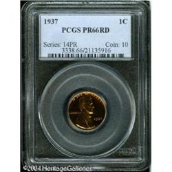 1937 1C PR66 Red PCGS. Cherry-red patina with pinp <B>1937 1C PR66 Red PCGS.</B></I> Cherry-red patina with pinpoint striking details and deeply-mirrored surfaces. Expectantly well preserved and unmarked, on obverse and reverse alike. Population: 142 in PR66 Red, 9 finer (11/04). <BR><BR><B>Important notice:</B> Heritage usually auctions material at the rate of 200-250 lots per hour. On some occasions eBay Live bid software or the Internet may not be able to keep up with the pace of the auction. We recommend placing a realistic absentee bid now as insurance to avoid disappointment. Occasionally the auctioneer may eliminate or reject an eBay Live bid, and the auctioneer may also reopen a lot after the close of the eBay live bidding (usually because we missed an audience bid), and may reject your bid even if it shows you as the winning bidder. By bidding via eBay Live, you agree that Heritage may award the lot to another bidder at its sole discretion under the circumstances described above or any other reasonable circumstances. Since eBay bids are not shown to us until we open the lot on the floor, we treat those bids just like floor bids. In most cases the floor responds before the eBay bid is presented to us, due to Internet lag time, so for consistency we have made it a policy that floor bids are always considered first over tie eBay live bids. Also please note that all Heritage lots purchased through eBay Live carry a 20% Buyer's Premium. Please make sure you read the Terms and Conditions before you bid. This lot is being auctioned in conjunction with a live floor auction by Heritage Galleries & Auctioneers. All final auction and invoice information will be supplied by Heritage Galleries & Auctioneers, and all other information should be considered preliminary. Lot:5416