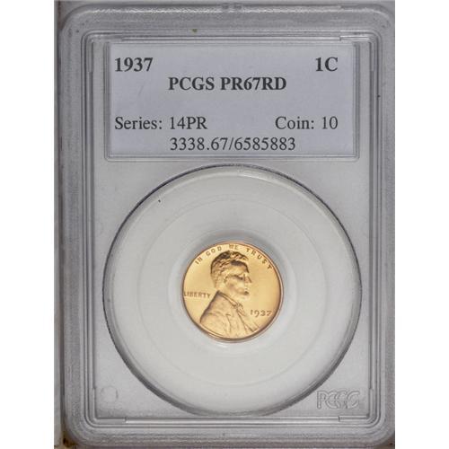 <B>1937<1C> PR67 Red PCGS.</B></I> Although the 1937 is not nearly as rare as the 1936, it is still an elusive coin as a Superb Gem. One of only 19 so graded specimens at NGC and PCGS (1/06), this is a fire-red survivor whose surfaces are undiminished by either toning or grade-limiting blemishes. Fully struck with uniformly reflective features.