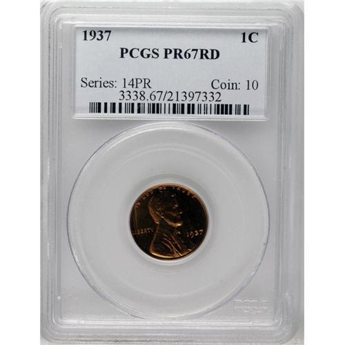 <B>1937 1C PR67 Red PCGS.</B></I> Deep cherry-red coloration and lovely proof luster are evident on the carefully preserved surfaces of this Superb Gem Lincoln cent. Only 9,320 pieces were minted, and a mere 20 specimens have been certified at the PR67 Red grade level by NGC and PCGS combined, with none finer (excluding Cameo coins), as of (12/06).<BR><BR><b>Shipping:</b> Coin/Currency (<a target="_blank" href="http://www.heritageauctions.com/common/shipping.php">view shipping information</a>)