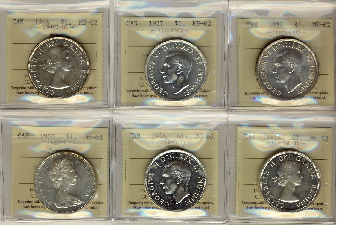 1937(2) $1, 1946, 1954(2) & 1965 T.5 ICCS MS62. Lot of 6 coins.