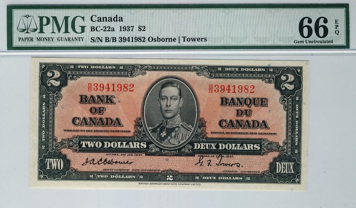 1937 $2 BC-22a #B/B3941982 PMG UNC66 EPQ, a perfect example. Rare this nice.