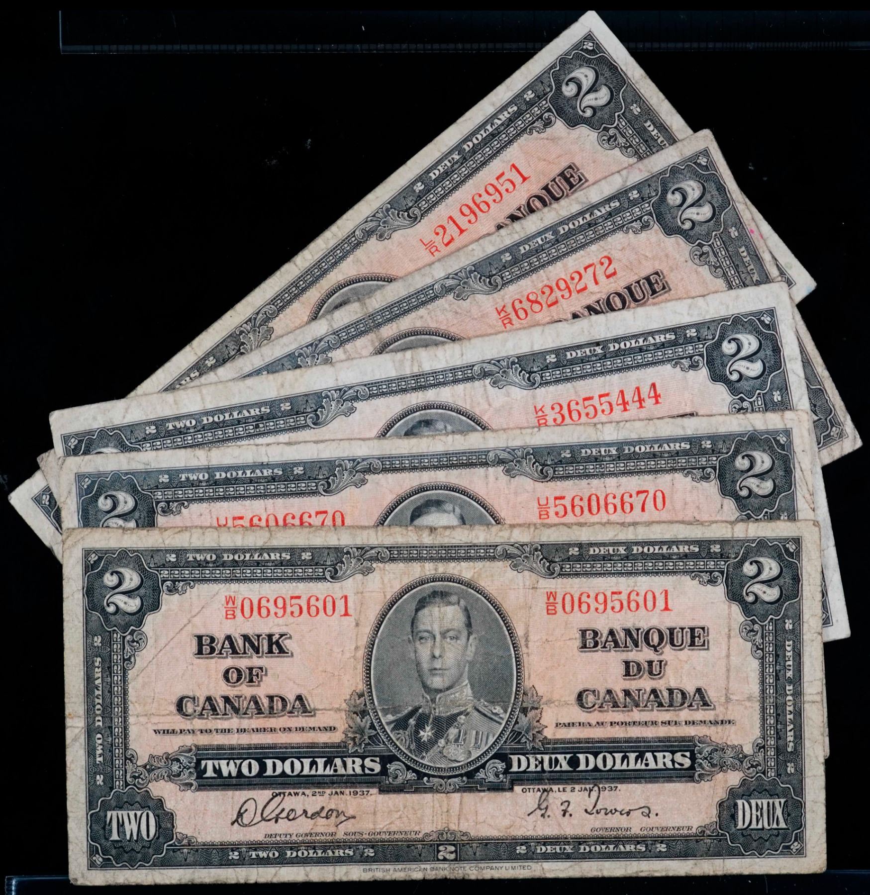 1937 $2 BC-22b & 22c VG to Fine, Lot of 5 notes.