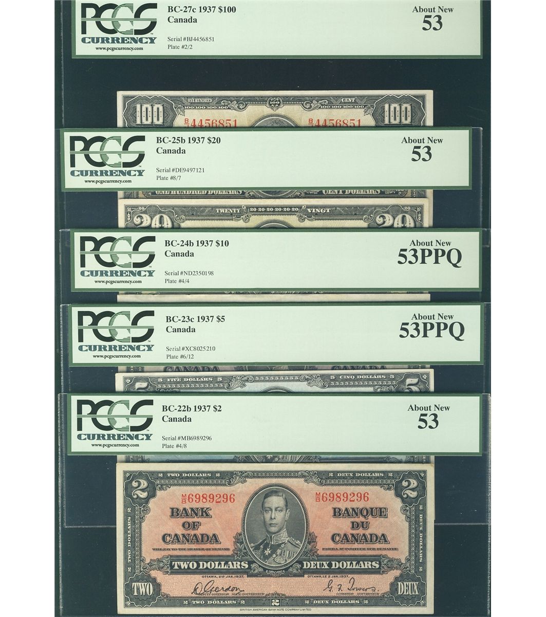 1937 $2 BC-22b, $5 BC-23c, $10 BC-24b, $20 BC-25b & $100 BC-27c all PCGS AU53. Lot of 5 notes.