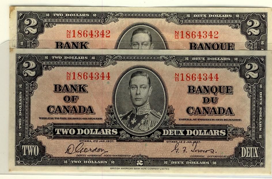 1937 $2 BC-22b. Lot of 2 notes both EF to AU.