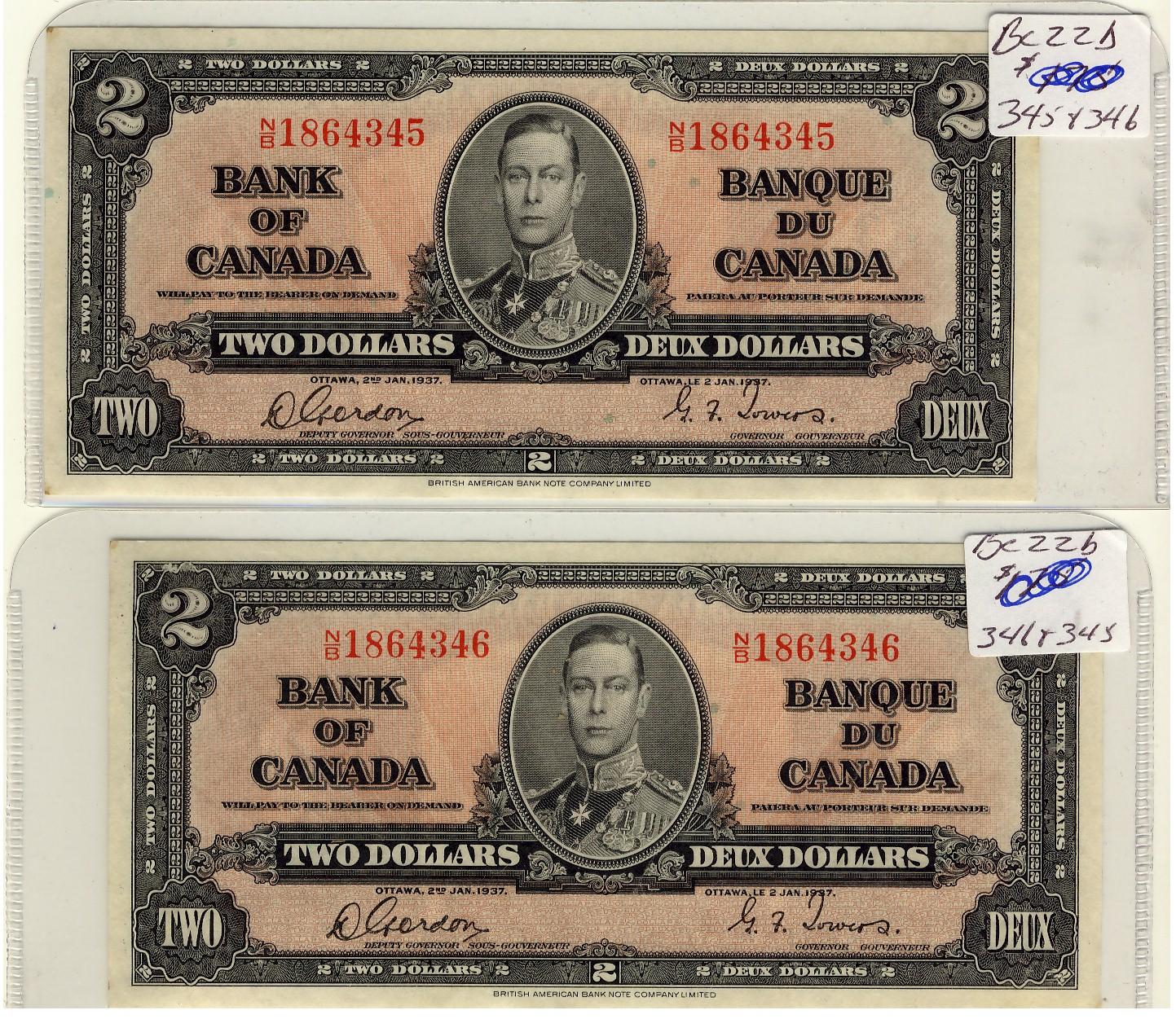 1937 $2 BC-22b #NB1864345-346. Lot of 2 consecutive AU-UNC notes.
