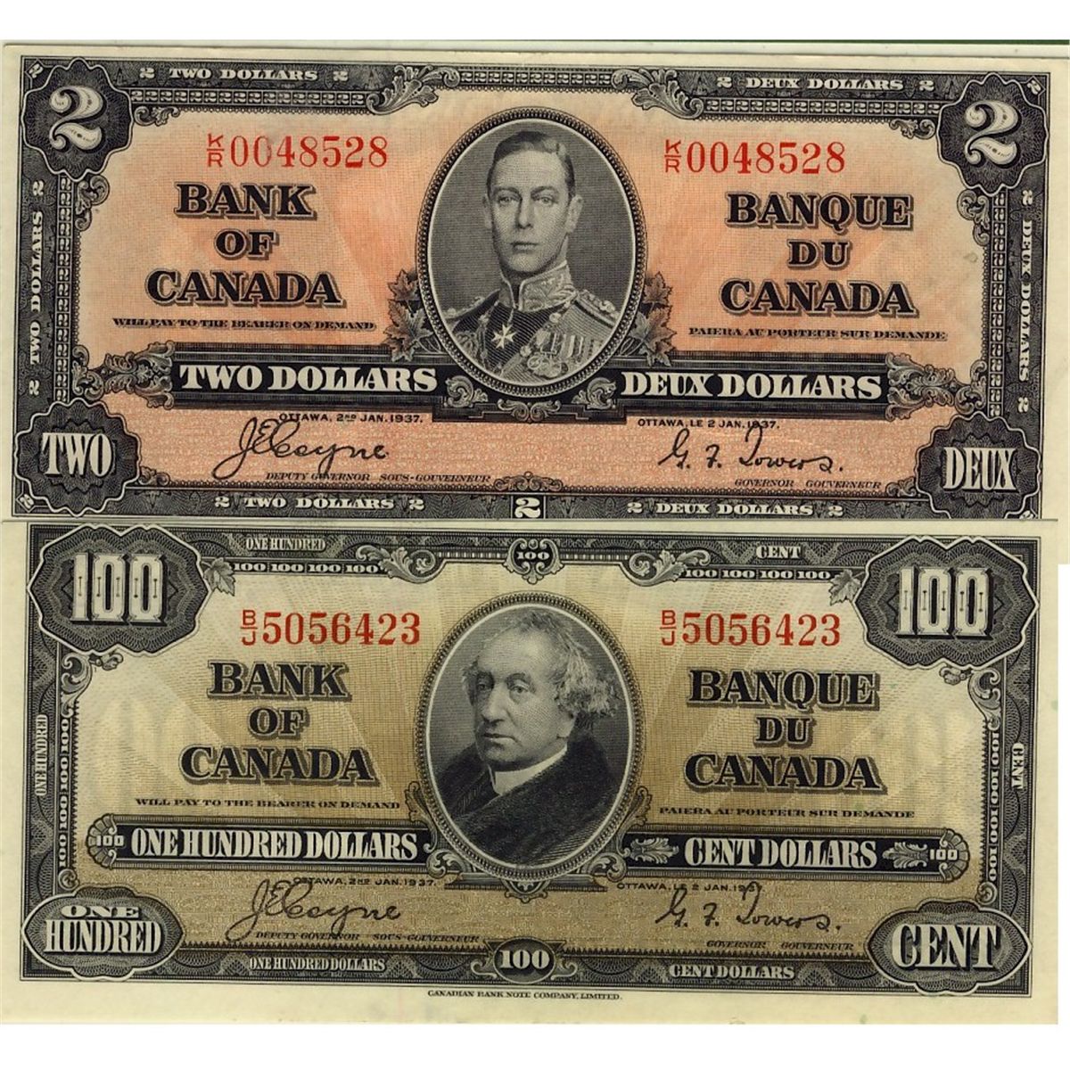 1937 $2 BC-22c, $100 BC-27c both PCGS AU50PPQ.