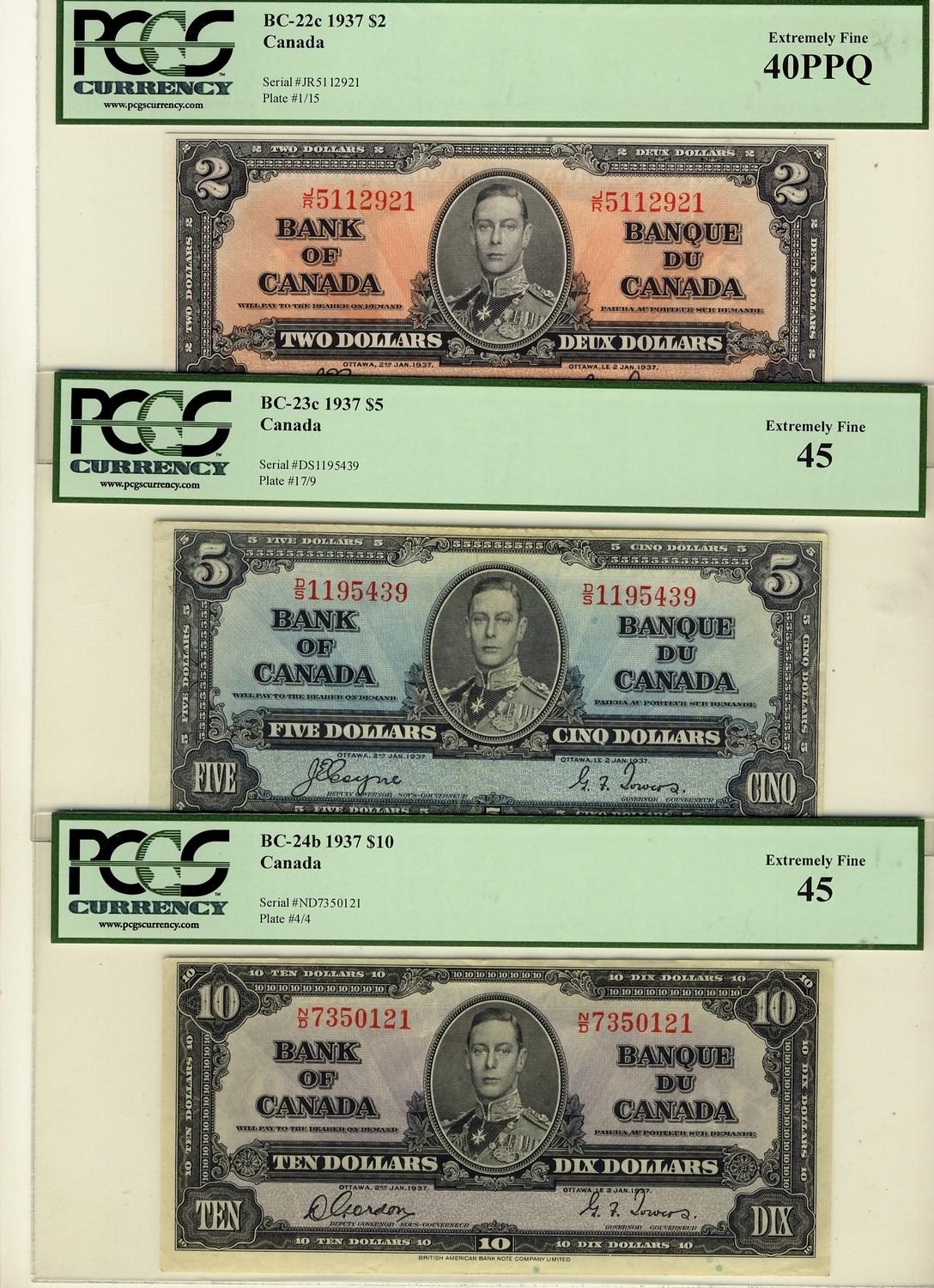 1937 $2 BC-22c EF40,$5 BC-23c EF45, $10 BC-24b EF45. Lot of 3 notes all PCGS graded.