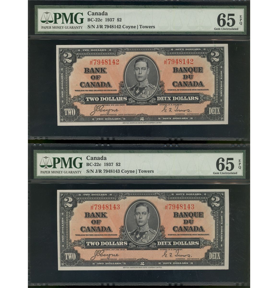 1937 $2 BC-22c #JR7948142 & 8143, PMG Gem UNC65EPQ. Lot of 2 consecutive notes.