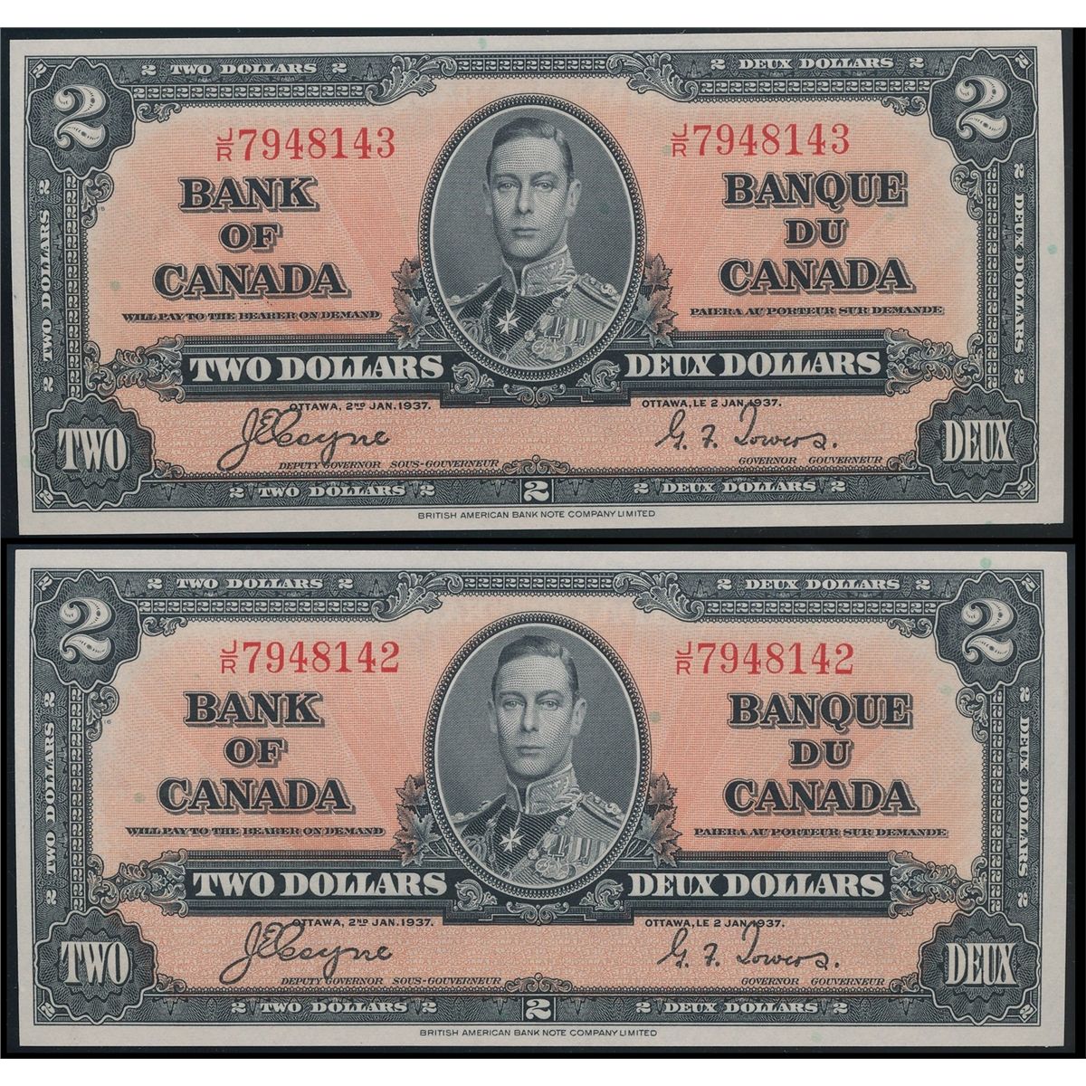 1937 $2 BC-22c #JR7948143-142, PMG Gem UNC65EPQ. Lot of 2 consecutive notes.