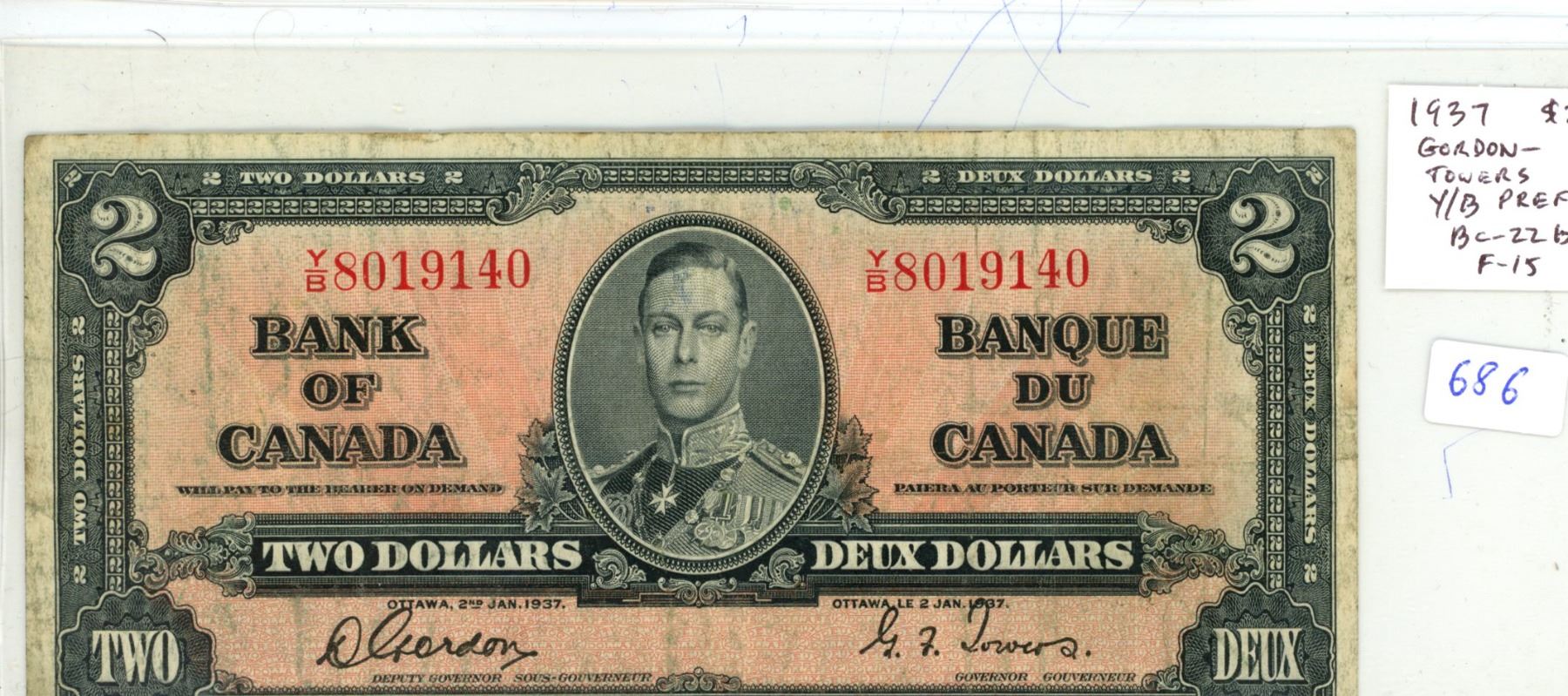 1937 $2. King George VI. Gordon-Towers signatures. Y/B Prefix. BC-22b. F-15.