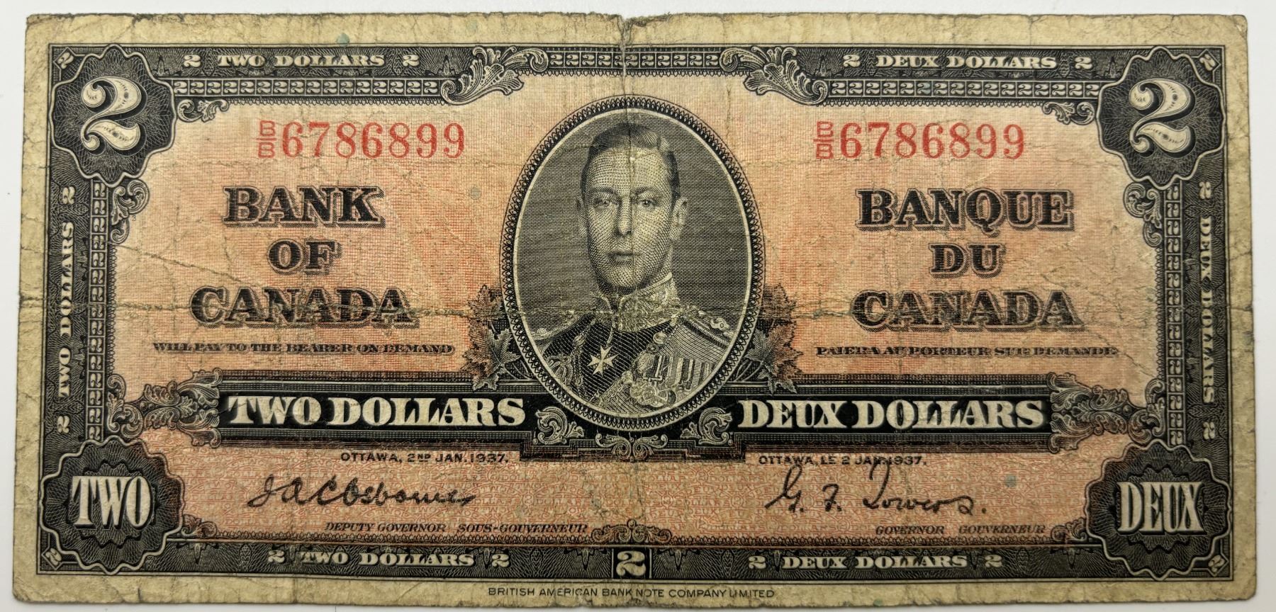 1937 $2. Scarce Osbourne/Towers signature combo. B/B6786899 tears